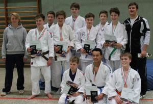 Der Deutsche Jugendpokal, ein etwas anderes Mannschaftsturnier, wurde in diesem Jahr erstmals von den Landesverbänden und dem DJB in die Wettkampfplanung aufgenommen. Für die U16 (Jg. 2002-2000) fand der Landesentscheid am 31. Mai in Duisburg statt. Hier konnten sich die besten drei Teams für das Bundesfinale in Frankfurt qualifizieren. Die männlichen Kämpfer der JG Münster hatten sich hierfür gute Chancen ausgerechnet. Dieses gesteckte Ziel war auch nicht ganz unrealistisch, denn man schrammte am Ende nur ganz knapp an diesem Erfolg vorbei. Das Team durfte maximal aus zehn Jungen bestehen, von denen jeweils fünf in verschiedenen Gewichtsklassen antreten mussten. Ein Hochsetzen und die Hinzunahme von Fremdkämpfern war anders als bei Meisterschaften nicht erlaubt. Mit einigen Einschränkungen kämpfte man nach den U18-Regeln. Für die Judogemeinschaft ging es mit drei Siegen im Hauptfeld gegen den PSV Herford (3:2), den PSV Krefeld (4:1) und dem Brühler TV (3:2) schnurstracks ins Halbfinale. Dort wartete die SU Annen. Gegen den späteren Turniergewinner war man mit einem 2:3 und der Unterbewertung 20:21 nicht ganz chancenlos, musste aber die knappe Niederlage hinnehmen. Eigentlich hätte man aber trotzdem bei einem üblichen Wettkampfmodus den dritten Platz erreicht. Jedoch musste der dritte Rang noch ausgekämpft werden, da es nur drei Startplätze beim Bundesfinale geben würde. Diese letzte Begegnung gegen Yamanashi Porz wurde erneut mit 2:3 verloren. Somit mussten sich die Münsteraner mit Urkunde und Medaille zufrieden geben. Im Herbst wird es diese Veranstaltung für die U14-Jugend geben. Auch hier wir die JG versuchen, ein durchschlagkräftiges Team zu stellen.