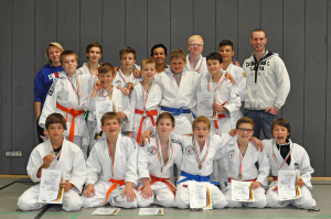 Am Ende stand der dritte Platz für das Jungenteam der Judogemeinschaft Münster bei den Westdeutschen Mannschaftsmeisterschaften am 13. Oktober in Düsseldorf. Nun zählt man zu den vier besten U15-Mannschaften in ganz Nordrhein-Westfalen - ein toller Erfolg für den im Verhältnis recht kleinen Verein. Allerdings war die Angelegenheit in der Landeshauptstadt spannender als so mancher sich wünschte, wenngleich der Bezirksmeister aus Münster einen guten Start erwischte. Gegen den Brühler TV gelang ein klares 7:1, was zunächst große Euphorie auslöste. Dann aber ging es gegen den Titelverteidiger. Die Kampfgemeinschaft Düsseldorf/Grevenbroich war auch gleichzeitig der Ausrichter und der Fanblock war reichlich gefüllt. Die JG ging 1:0 in Führung, aus dem fest eingeplanten nächsten Sieg wurde allerdings „nur“ ein Unentschieden. Der folgende Kampf wurde aber wieder gewonnen und mit dem kommenden Fight sah man sich schon fast auf der Siegerstraße. Jedoch musste der Münsteraner Kämpfer – deutlich in Führung liegend – sozusagen mit dem Schlussgong eine Niederlage hinnehmen. Durch eine Fußverletzung war die volle Konzentration einfach nicht mehr aufrecht zu erhalten. Auch die nächste Begegnung wurde an den Lokalmatador abgeben. Somit schwanden die Chancen, 'das Ding' noch erfolgreich nach Hause zu schaukeln, denn es stand inzwischen 2:2. Die nächste Auseinandersetzung verlief siegreich für die JG, doch es kam wieder der Ausgleich durch Düsseldorf. So musste es der letzte Kämpfer entscheiden, der es besonders spannend machte. Erst nach der vollen Kampfzeit konnte er den nötigen Punkt holen und somit mit 4:3 den Sieg einfahren. Das Halbfinale war erreicht. Nun galt es zu pokern. Gegen den JC Hennef rechnete man sich nur eine kleine Chance aus, denn der Meister aus dem starken Bezirk Köln hatte seinen ersten beiden Gegner mit 8:0 von der Matte gefegt. Am Ende hieß es 3:5, allerdings wäre durchaus mehr drin gewesen, waren sich auch die JG-Trainer Kai Strietzel und Svenja Reißberg einig: „Ein sonst aussichtsreicher Kämpfer ist noch wegen der Verletzung angeschlagen, ein anderer guter Mann verliert unglücklich, weil ein Wurf, der außerhalb der Kampffläche erfolgt, als 'innerhalb' gewertet wird“. Aber es war noch nicht alles verloren. Immerhin konnte man nun das „Kleine Finale“ kämpfen, wo es um Bronze ging. Auch hier war die Spannung kaum zu überbieten. Die JG ging 2:0 in Front, Yamanashi Porz glich aus. Dann stand es 2:3, doch diesmal gelang Münster der Ausgleich und sogar das 4:3. Jedoch war der letzte Kämpfer dem Kontrahenten aus Porz körperlich unterlegen. Jetzt musste taktiert werden. Wenn schon kein Sieg gelingen konnte, so durfte die Niederlage aber nicht vorzeitig mit Ippon erfolgen, sondern nur mit Wertung über die Zeit. Der Münsteraner hielt dem Druck stand und brachte den Kampf zu Ende. Zwar hatte er dieses Duell verloren, aber durch das 4:4-Unentschieden und die bessere Unterbewertung ging die JG Münster als Sieger hervor, was den dritten Platz bedeutete. Der Jubel war am Anfang noch etwas verhalten, als aber Bronzemedaillengewinner (Olympia 2012) Andreas Tölzer den Kindern bei der Siegerehrung die Medaille um den Hals hängte, war die Freude doch riesengroß.